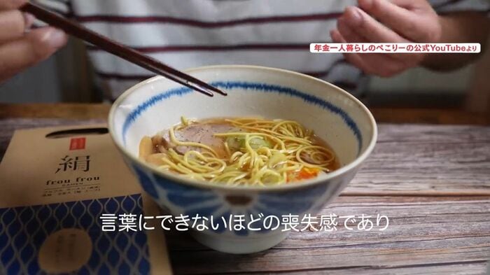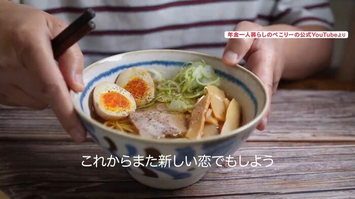 ラーメンを作って食べるぺこりーのさんの映像に、白い文字が書かれているシンプルな内容…。