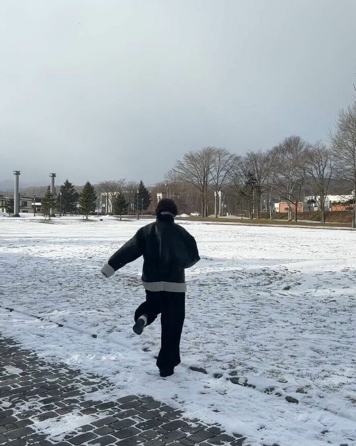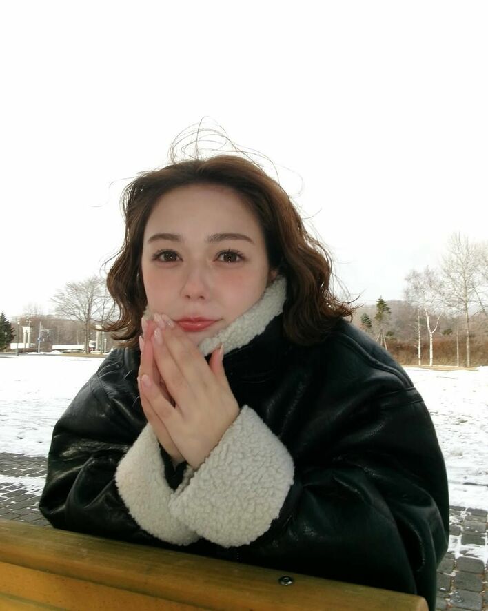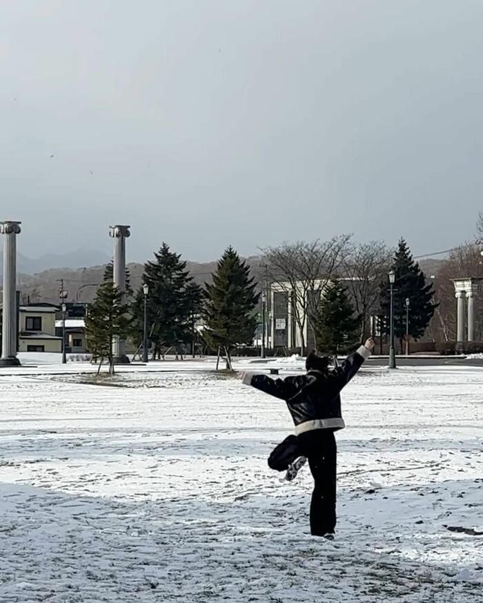 村重さんは「一瞬だけ北海道いましたよー寒かったー!」とつづり、黒いボアジャケットを着たオフショットを公開しました。空は真っ白で地面にもうっすらと雪が積もっていて、かなり寒そうです。
