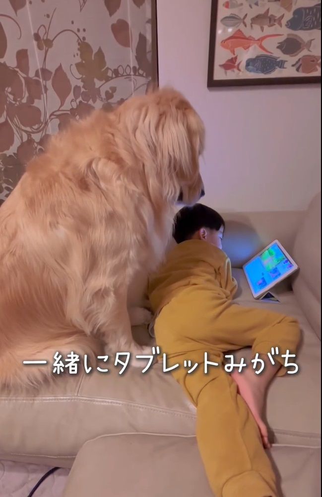さらに、ソファで一緒にタブレットをみる様子も。後ろからそっとタブレットを見る「エル」くんの姿が、まるで見守っているようで、なんともかわいらしいですね。