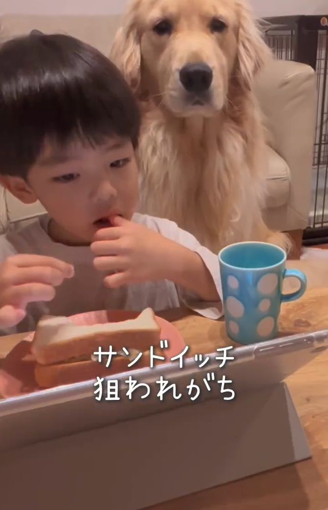 そこには、「サンドイッチ狙われがち」というコメントと共に、画面手前で、サンドイッチを食べる子どもの姿が。