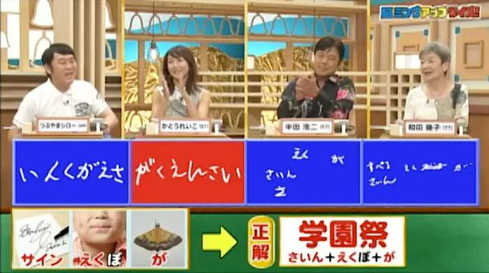 正解は「学園祭(さいん+えくぼ+が)」。かとう1人がまたまた正解!