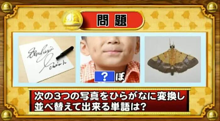 最後は、シャッフル写真の問題。次の3つの写真をひらがなに変換し、並べ替えて出来る単語は何か?