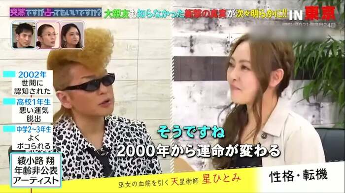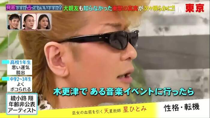 続けて「高校1年。ここから悪い運気が抜ける」と星がいうと、綾小路はちょうどその頃に木更津で開かれていた音楽イベントに行き、「今まで自分がまったく見たことのない音楽の世界を見て、『あっこれだ!』と思ったのが高校1年のときですね」と自身のターニングポイントを振り返った。