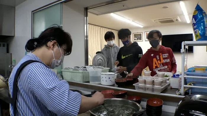 コロナ禍で大学の講義はすべてリモートのため、選手たちの日々は、練習場と寮の往復となっている。だからこそ、選手たちにとって夕食は、楽しいひととき。