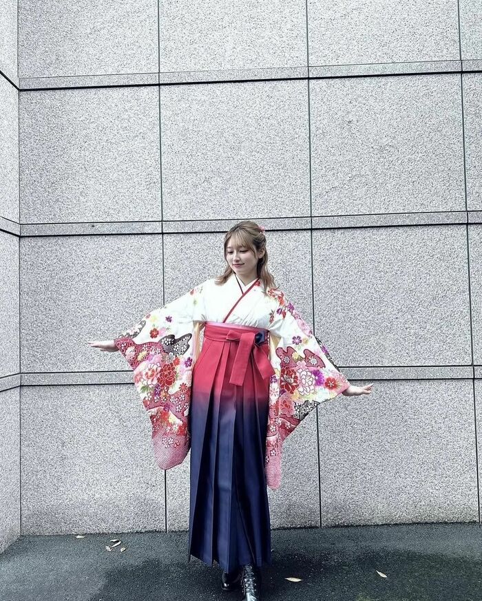 公開された写真には、花が描かれた赤や紫色の袴姿の吉川さんや…。