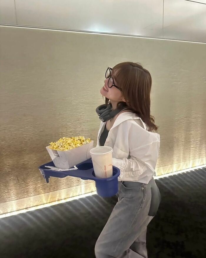 笑顔で大きなドリンクと大きなポップコーンを持つ姿はオフ感満載ですね。