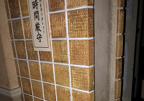 MDFをルータで彫って目地を表現した「スクラッチタイル風」パネル。“タイル”の表面は、ナコ(※)を塗って厚みを出してから「櫛引」加工を施します。塗装で仕上げ、ムラでタイルの質感をつけたら出来上がり。