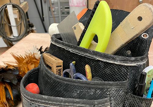 経師の七つ道具を詰め込んだ「経師道具ガチ袋」。地ベラ、スキージ、なで刷毛などが活躍する。紙と糊・ボンドなどを手に、いざ出動。