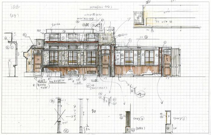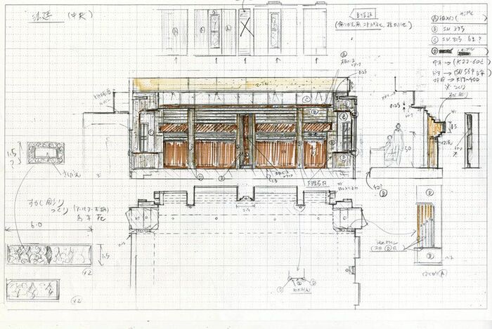 膨大な数の建具倉庫から、この空間にしっくりくるレトロな窓を厳選。装飾とのバランスも考えて、デザインに落とし込んだ。