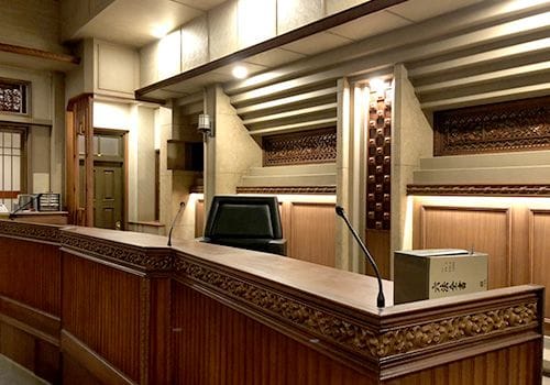 緊張感が支配する法廷セット。整然とした中にも美術スタッフの工夫とプロの技が隠されている。