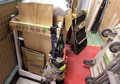 紙貼りを担当するのは「経師(きょうじ)」スタッフ。バックヤードには「経師用台車」が。