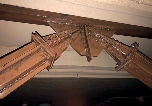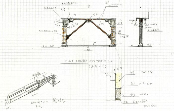 一際目を引く耐震補強鉄骨は、テレビジュツではおなじみの木製大道具。