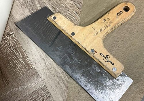 段々の部分は浮き上がらないように、入隅までしっかり貼り込み。この時威力を発揮するのが「スキージ」。最後に、入隅で紙を切り取るために「地ベラ」が登場する。