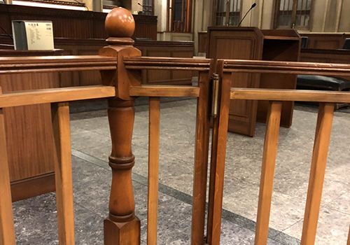 法廷にある木の柵にも、もちろん汚し塗装が。人の手が触れる手すりの上部は、程よく塗装が剥げている。