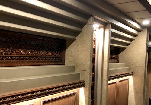 あとは壁の色。法廷の基調色としてはかなり明るめのベージュ。木目も軽めにして、配置も腰から下やワンポイントに留めました。床は石のタイル風ですが、こちらも明るめの薄いグレーにしています。