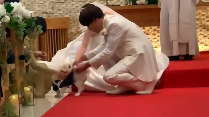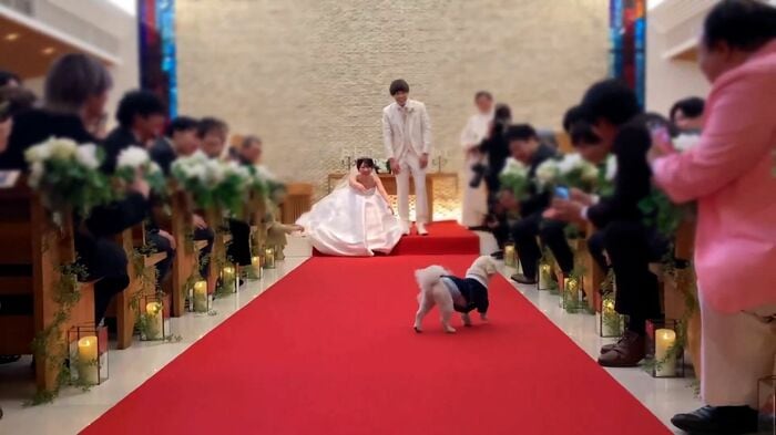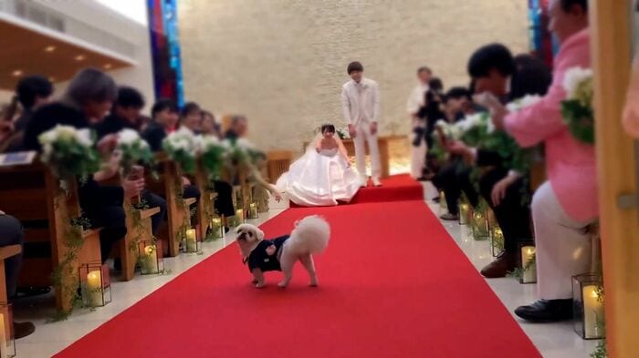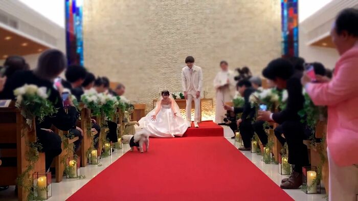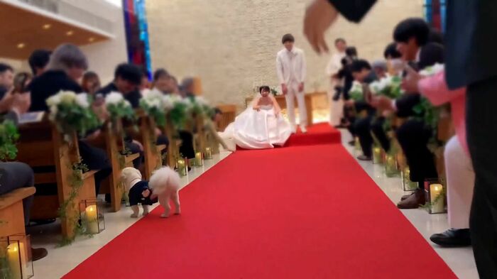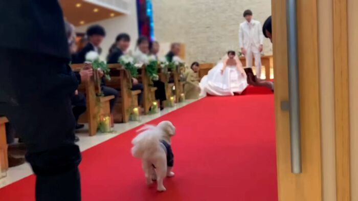 真っ直ぐ歩いていくかと思った矢先…ちょこちょこちょこっと参列者が座る席の方へ歩き出してしまったムーチョくん。