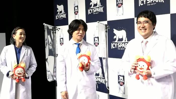 CMに登場する「炭酸研究所」の「1日研究員」として白衣姿で登場した3人。イベントでは炭酸の強さが実際どのくらいなのか試す実験やトークセッションが行われた。