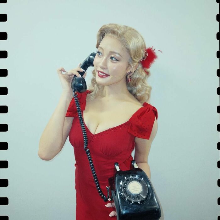 胸元がざっくり開き、肩にはリボンがついた真っ赤なドレスをまとった王林さんが、黒電話を持ってポーズを決めている姿も!