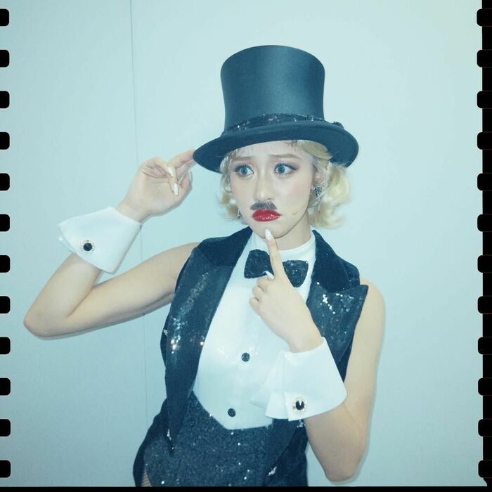 また、別の写真では、蝶ネクタイがついたノースリーブのシャツに黒いベストの衣装姿も披露。