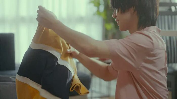 最終話である第4話では、切れたシャンプーを彼女と一緒に買いに行くために、彼女が作業中の洗濯物を一緒にたたむという内容。彼女の手元を確認しながら見よう見まねで、ぎこちなく服をたたむ佐藤。