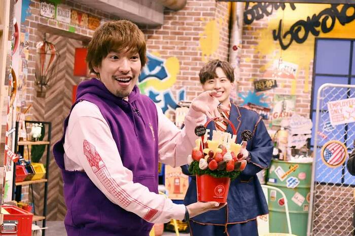 赤いバケツ型の容器にはかわいいフルーツがデコレーションされており、それを受け取ったりんたろー。は驚いた表情で「マジで!?」と大喜び。