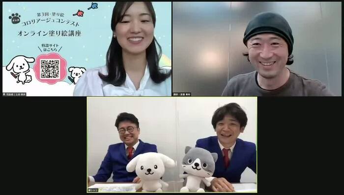 5月2日(日)、ダス犬コロリアージュコンテスト「オンライン塗り絵講座」が行われ、ゲストにお笑いコンビの銀シャリ(鰻和弘、橋本直)が参加した。