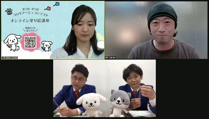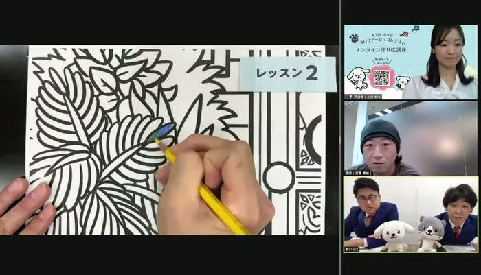本イベントでは、オンラインにて一般の参加者と一緒に、銀シャリがバンタンデザイン研究所講師でプロ画家の渡邉貴裕氏の指導の下、コロリアージュ(塗り絵)に挑戦。
