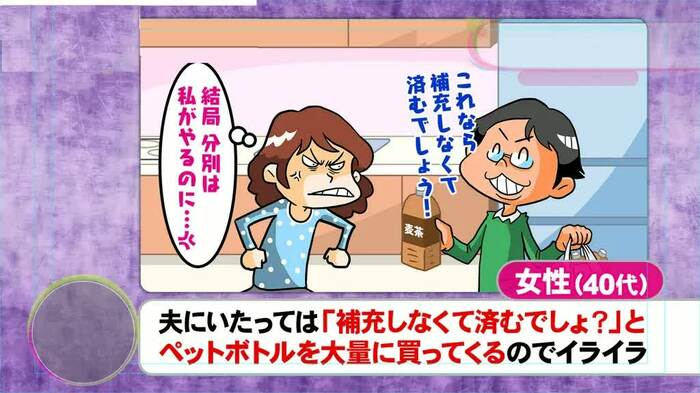 「麦茶がなくなっても作ろうともしない家族。挙句の果てに、夫がペットボトルの麦茶を買ってきた。分別して捨てるのは私なのに…」という40代女性のお怒りエピソードでは、「せきらら投票」で「ペットボトルを買ってくる夫にイライラするか、気にならないか」を問いかけた。