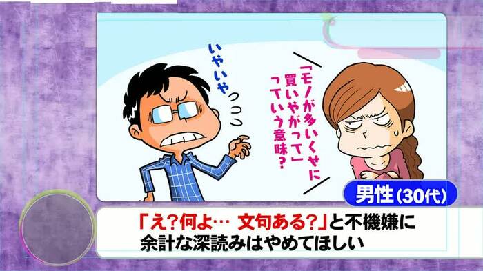 まず登場したのは「新しい収納ケースが届いていたので、『いつ買ったの?』と聞いたら妻が不機嫌になった」という30代男性のエピソードだ。妻は、夫から買ったことを責められたと感じて不機嫌になったのだという。