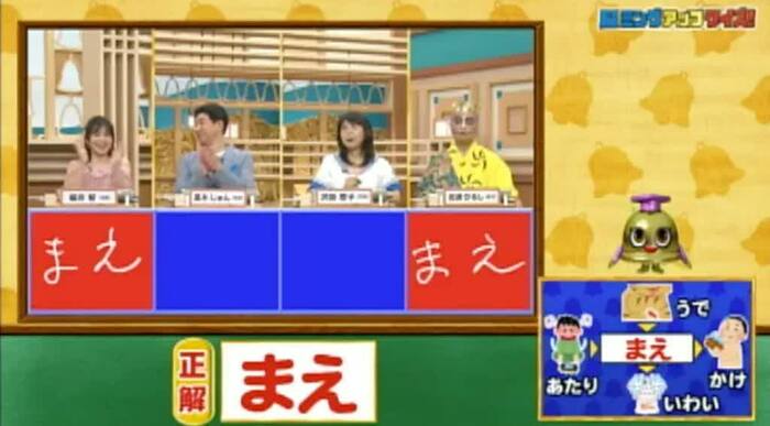 正解は「まえ(当たり前・腕前・前掛け・前祝い)」。