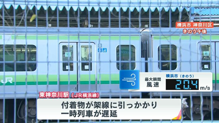 最大瞬間風速20.4mを記録した横浜市では、JR横浜線の東神奈川駅構内で、付着物が架線に引っかかり、一時、列車が遅延する事態に。