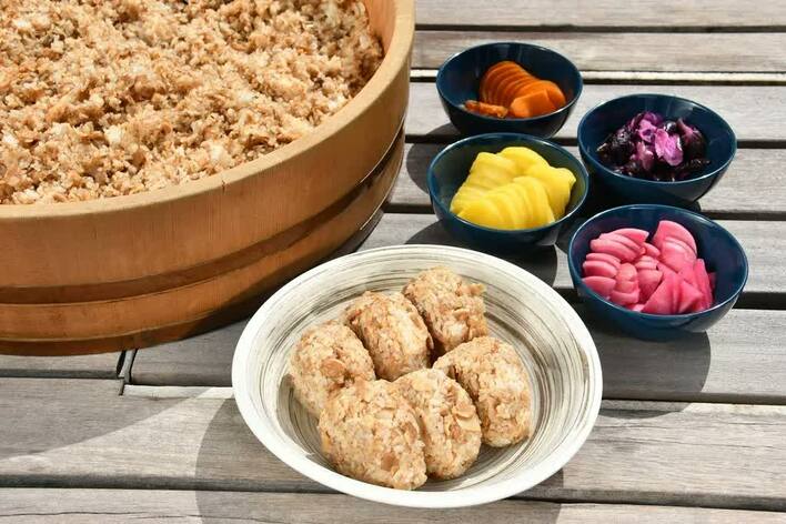 おひつに入った「ごんじゅう」を見て、「チャーハンのようにも見えますね」と松岡が率直な感想を伝えると、「豚肉、油揚げ、かつお節を甘辛く煮詰めて炊いたごはんに混ぜています」と留美子さんが調理方法を教えてくれた。