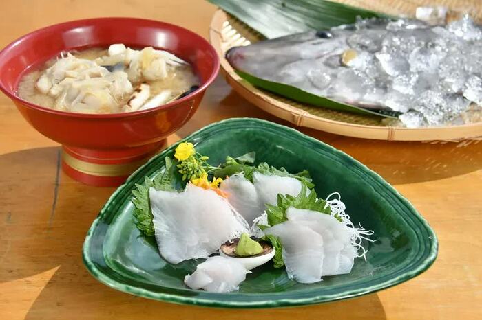 まずは新鮮なウスバハギをお刺身でいただくことに。…と、松岡の目の前に置かれたウスバハギが勢いよく跳ね上がるハプニングが。「びっくりしたー!背筋がやっぱりすごいんだ」と驚きつつも、ウスバハギの背筋力を褒める松岡に思わず梅木さんも笑っていた。