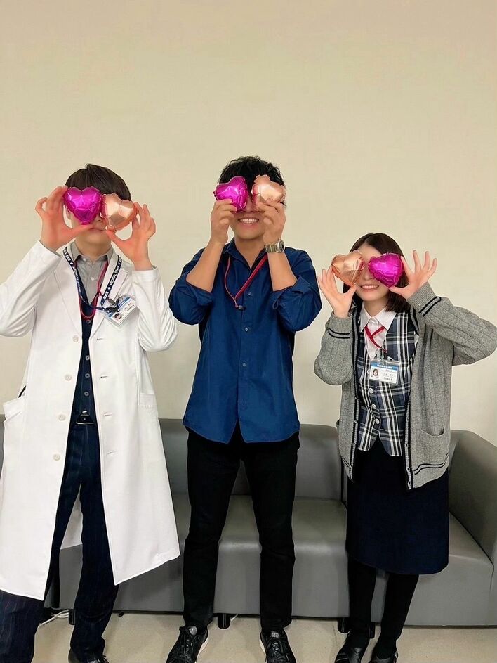両手にハート型のバルーンを持ってポーズを決める3人。それぞれの役柄を意識してか、ニッコリ笑う桐谷さん&長濱さんに対し、真面目な表情に見える瀬戸さん。