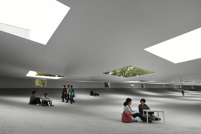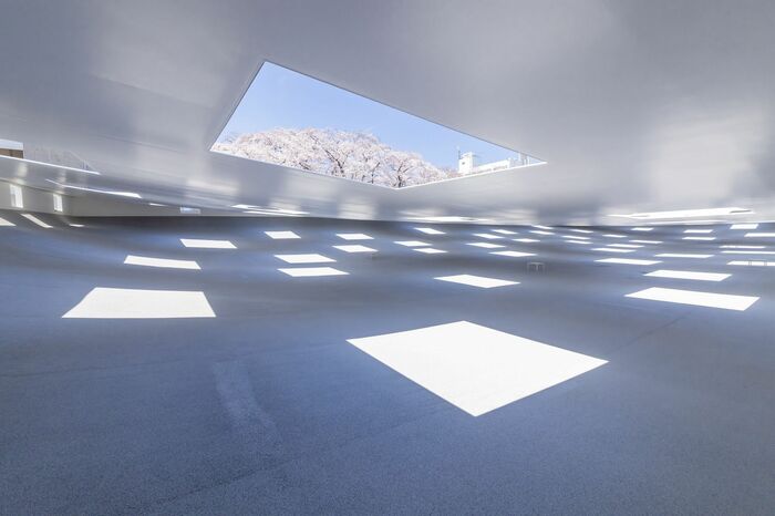 あと、天井は規則的に穴が開いているので、太陽の光が入ってきますし、雨の日には雨が入ってくるんです。壁も天井も床も真っ白なので、天気によって見え方が変わってくるところも楽しみの一つ。雨の日には建物の中に水たまりができちゃうけど、それも1種の模様に見えてキレイだし、晴れの日には天井の穴から入り込む光が床に模様を作っていてそれも可愛いし。