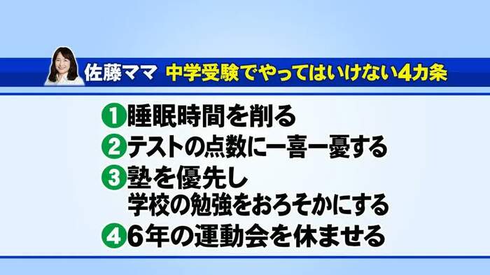 「友達が合格して、自分が落ちるのが一番の悲劇。中学受験は親が戦略的に仕上げる必要があるので、受験させるなら迷っている時間はない」という佐藤ママは、「中学受験でやってはいけない4カ条」も披露した。