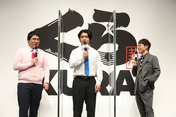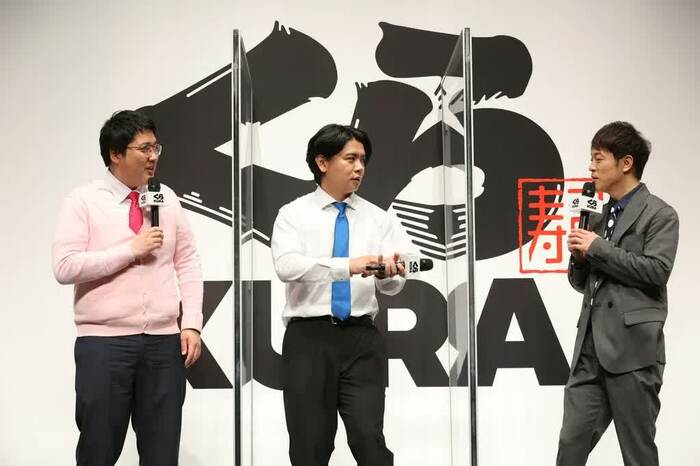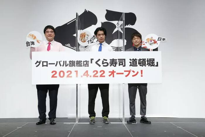 陣内智則とマヂカルラブリー(野田クリスタル・村上)が4月21日(水)に行われた、グローバル旗艦店「くら寿司 道頓堀」オープン発表会に出席した。