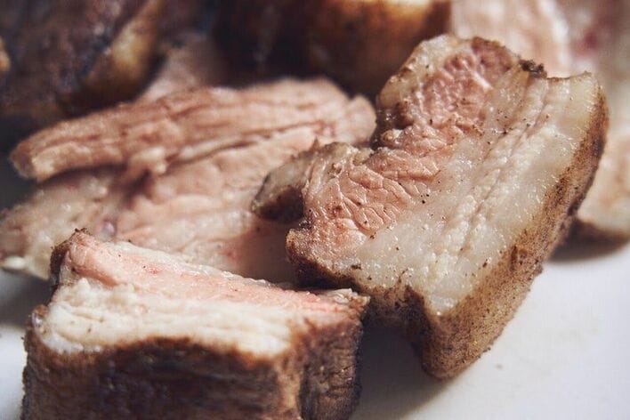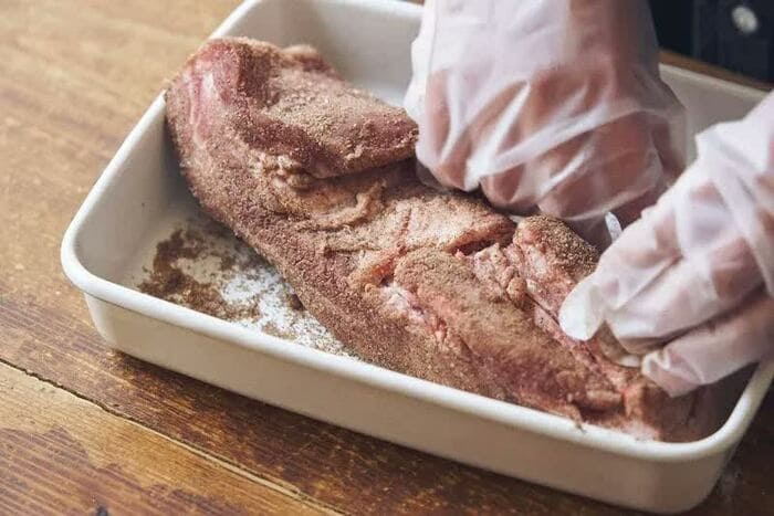 豚バラ肉の水気をキッチンペーパーで拭き取り、お塩大さじ1、オールスパイス小さじ2、白コショウ小さじ1を、豚バラブロックに全体にまぶします。