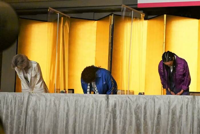 「こういう身なりなのに、白湯を飲んでオーガニック生活しています。お詫びいたします」(大島)、「とにかくこの姿をお詫びします」(遠藤)、「地上最強のOLということで眉毛をなくしてしまったこと、今のこの状況がまるでコントじゃんかと笑ってしまっています。お詫びします」(小池)と、続々と思い思いに“ご挨拶謝罪”をした。