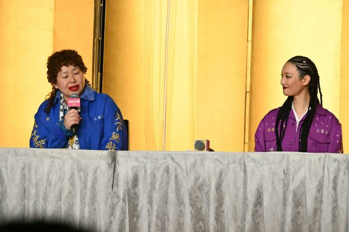 出演者たちは劇中で、壮大な抗争を繰り広げるOLを演じた衣装で金屏風前に登場。主演を務めた永野は、「映画とはいえ、暴言を吐き続けOLのイメージを損ねてしまいました。申し訳ございませんでした」と謝罪し頭を下げた。
