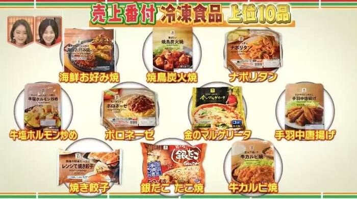 まずは「冷凍食品部門」。約80種類も展開している冷凍食品の売上上位10品には、パスタやピザ、餃子や唐揚げなどの人気商品が並ぶ。