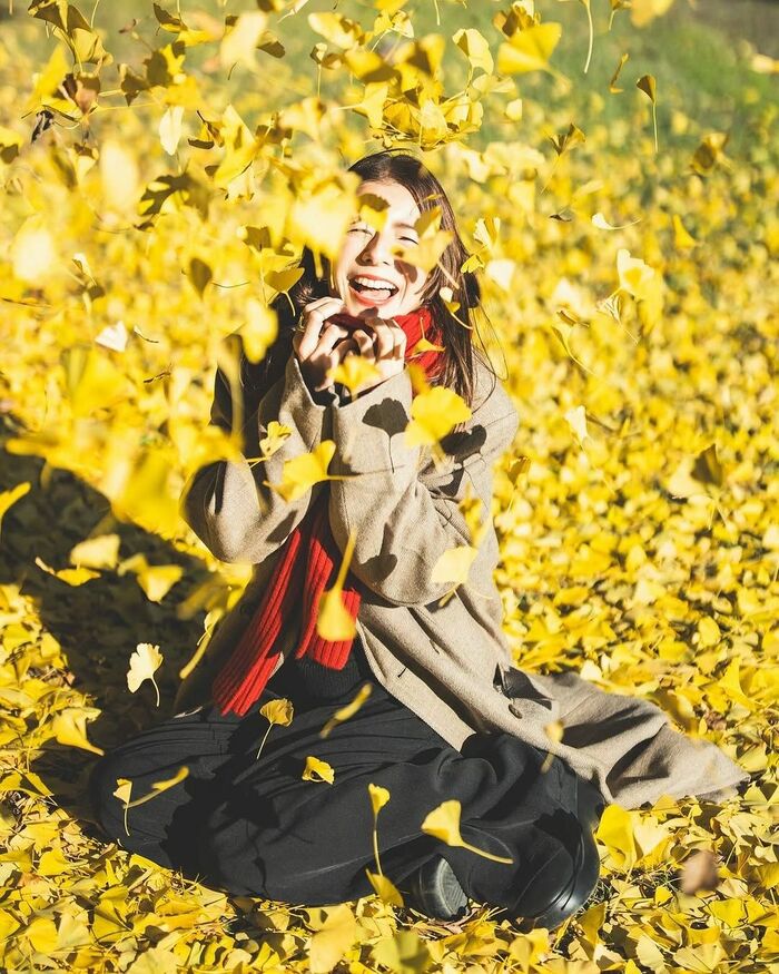イチョウが舞う中、カメラに向けて満面の笑みを見せる姿も!