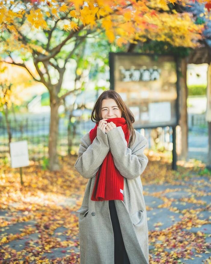 別の写真では、赤いマフラーを両手で押さえ、口元を隠しながらカメラにほほ笑む姿も!