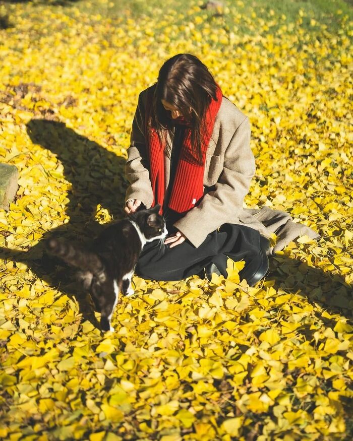 他にも、地面を敷き詰めるように落ちた、たくさんのイチョウの上に座り、猫とたわむれている様子や…