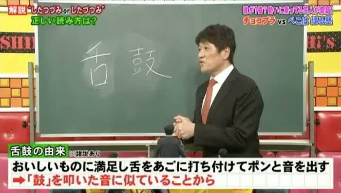 美味しいものを食べたときに「舌鼓を打つ」と表現するようになった理由は、昔、美味しいものを食べて満足したときには舌をあごに打ち付けて音を出す習慣があり、その音が「鼓(つづみ)」を叩いたときに似ていたからだと言われている。