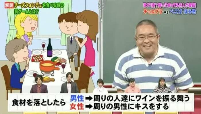 各国の伝統的な料理に関する問題では、地理担当の村瀬哲史先生がスイスのチーズフォンデュについて解説を加えてくれた。スイスでは、料理を食べるときに罰ゲームを課せられるのだという。