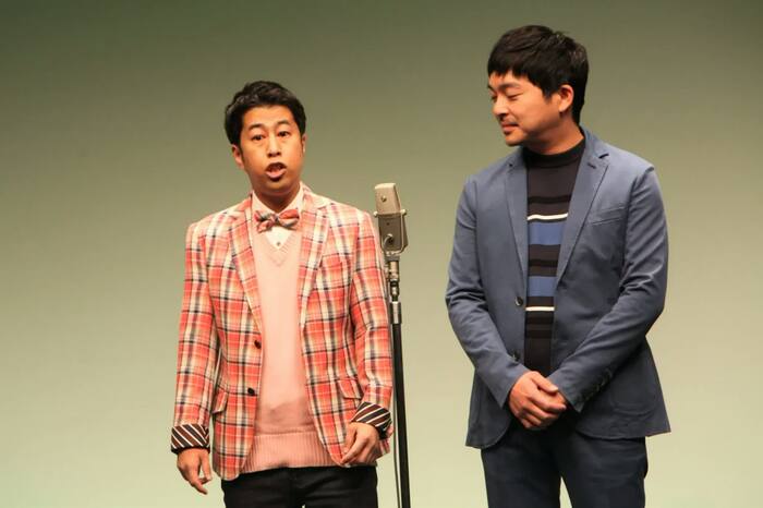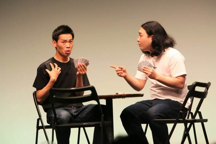ゲストとして最初に登場したのは、かが屋。トランプの“大富豪”をする4人(もちろんあとの2人はエアー)。その中で加賀は電話の相手であるサキちゃんと話し込み、「ちょっとベランダに行ってくるわ」と席を外す。その態度に怒り出す他の2人を「あいつもええとこあるんよ」と熱弁する賀屋、舞台上には賀屋だけにも関わらず、そこにいない2人が見えてくるような展開。ベランダから戻ってくる加賀と再び大富豪をする4人の感情がはっきり浮き彫りになる終盤。かが屋ならではのワンシチュエーション劇は、観客を引き込む力は圧倒的で、笑いとともに大きな拍手も沸き起こった。