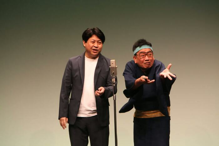 さらに、「タイタンライブ」でおなじみのBOOMERは、漫才のセンターマイクの前に。伊勢は立川談志師匠に扮した姿で登場し、途中からは河田と2人で歌を歌うという形式に。クリスタルキングの「大都会」、Sugarの「ウェディング・ベル」、シャネルズの「街角トワイライト」と、昭和歌謡のみの選曲で押し切り、観客の高年齢層を引き込む展開に。