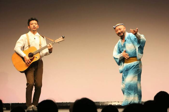 さらに、森が「盆踊りをご用意しました」と観客に振り付けをレクチャーし、浴衣姿に着替えた江口が登場。「ウマナミハルオでございます~」とあいさつし、YouTubeで再生回数100万回を超えるという「イチモツ音頭」を披露。「チョーメチョメチョメしてみませんかぁ♪」と高らかに歌い上げ、会場も謎の一体感に包まれた。