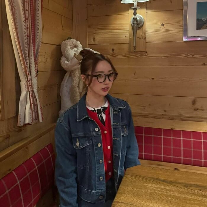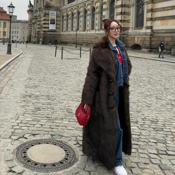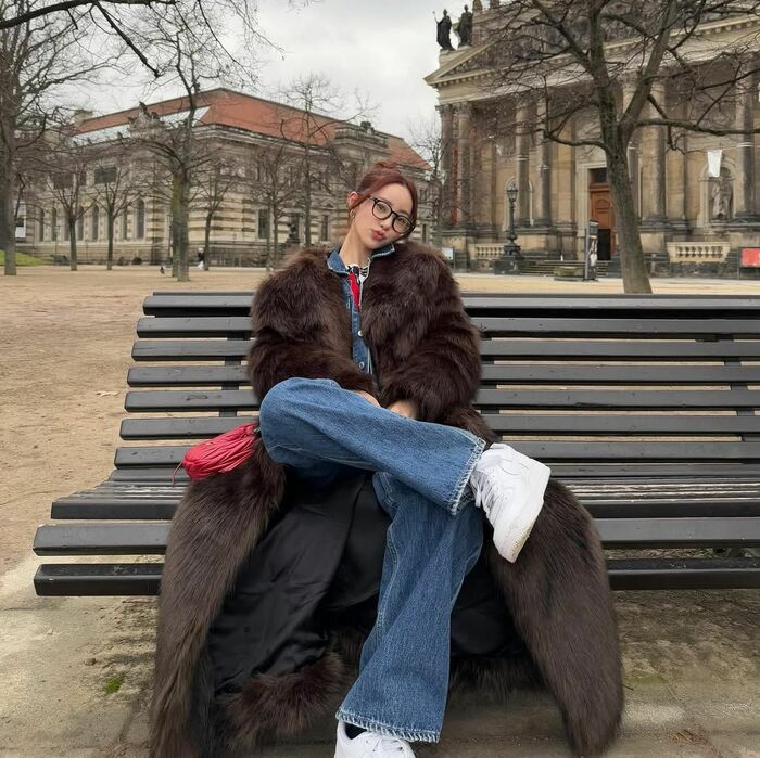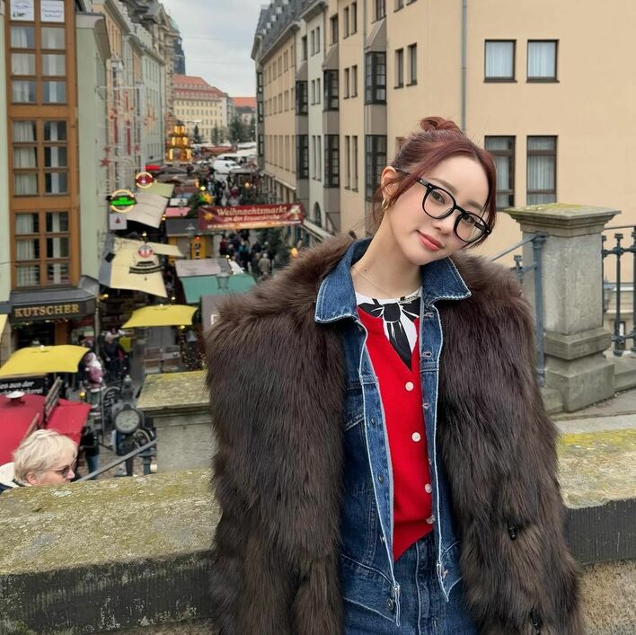 中町さんは「やっぱり冬が好き」とコメントし、 お団子ヘアで黒縁メガネをかけ、デニムのセットアップに茶色いもふもふのファーコートを着た冬コーデを披露。インナーに着ている赤いカーディガンと、赤いバッグが目を引きます。